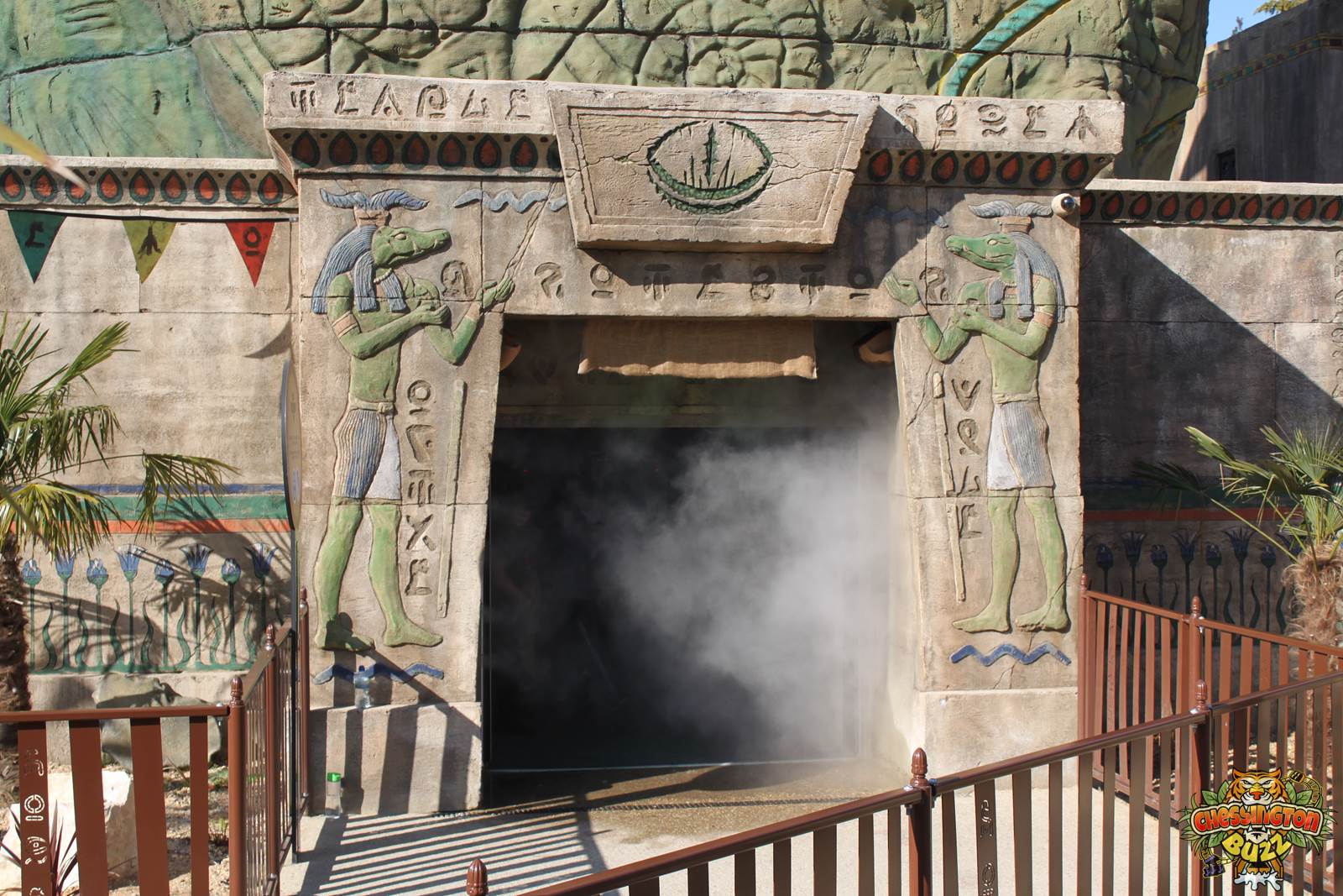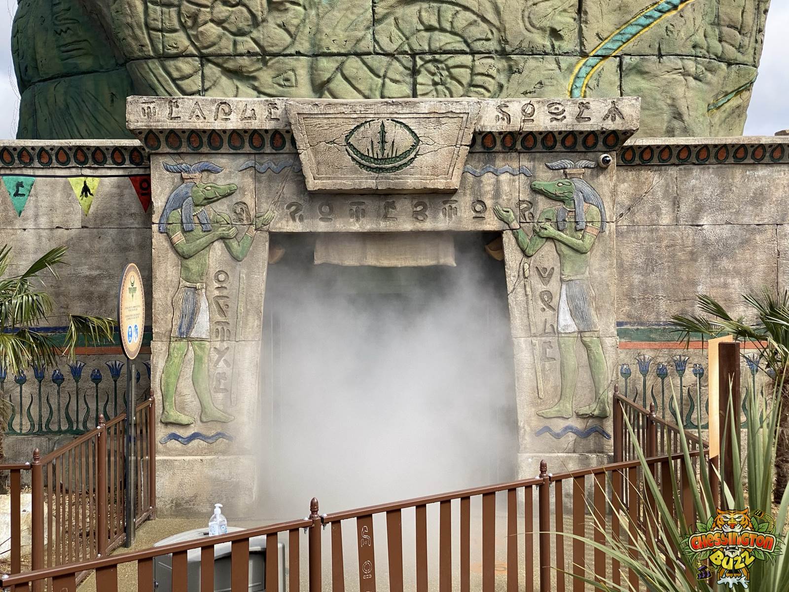 From the moment you arrive, the towering crocodile dominates the landscape. The ride is themed to Sobek, the Egyptian crocodile deity, and the detail immediately pulls you into a cursed world. As you step closer, the atmosphere intensifies. Ancient stonework, towering statues, and eerie sounds set the scene for what lies ahead. Meanwhile, the ride’s powerful slogan, “Brave the Drop, Release the Curse,” drives the story forward.
